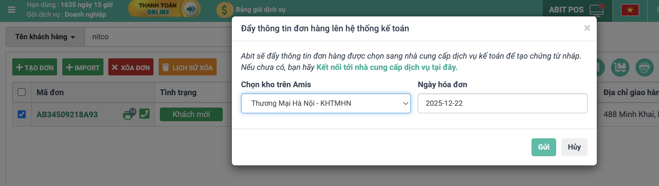 Nhằm hoàn thiện hệ sinh thái quản lý doanh nghiệp, Abit ra mắt tính năng tự động đồng bộ với phần mềm kế toán. Hiện tại Quý khách hàng đã có thể đẩy thông tin đơn hàng lên phần mềm Kế toán Amis của Misa để tạo khởi tạo chứng từ bán hàng